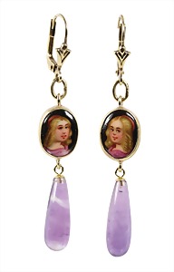 a pair of ear pendants, yellow gold 333/000, miniature painting on porcelain (around 1870/80), hanging amethyst drops, height = 55.2 mm, (brisures more recent)