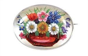 Brosche, um 1900 IDAR-OBERSTEIN, Silber, von hinten gravierter Bergkristall (Intaglio) mit feiner Haar-Malerei, rote Schale mit einem farbenfrohen Blumenbouquet, von hinten mit einer Perlmuttscheibe hinterlegt um die Strahlkraft zu erhöhen, ca. 24,4 x 19,4 mm