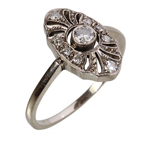 ring, ART-DECO 1930/'40s, white gold 585/000, 1 diamond/brilliant c. 0.13 ct white, outside in the wreath 8 pieces 8/8 cut diamonds white, ring head c. 8.8 x 14.8 mm, ring width c. 55