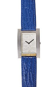 designer wristwatch, quartz, silver 925/000, rectangular case, clockface with graphic lines, snap off case back, c. 30.0 x 40.0 mm, blue leather watchstrap (shark) with silver clasp, watch is running ! unworn !