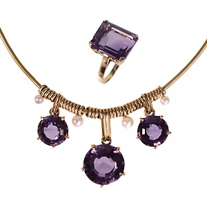 lot: 1 ring yellow gold 585/000 (tested), octagonal amethyst c. 11.5 ct (c. 15.0 x 12.4 mm), ring width c. 47, necklace, yellow gold 375/000, 3 amethysts circular (faceted), total c. 23.0 ct, 2 x 11.5 mm and 1 x 15.2 mm, 4 Akoya pearls hanging on eyes, length = c. 45.5 cm, total 31.3 g