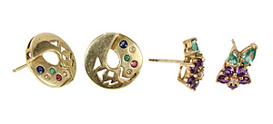 Lot: 2 Paar Ohrstecker, GG 585/000, mit unterschiedlichen Edelsteinen besetzt, u. a. Brillant, Saphir; Smaragd, Amethyst etc., alle facettiert, D = 15,5 mm, ohne Mechanik, total 7,4 g