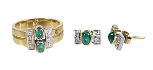 lot: ring and ear studs, yellow gold/white gold 750/000 (tested), 4 emerald cabochons, 16 brilliants c. 0.22 ct tw/w-si, 1 ring, ring width c. 56, a pair of ear studs c. 6.3 x 10.8 mm, total 11.0 g