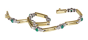 bracelet, yellow gold/white gold 750/000 (tested), 8 emerald cabochons, 32 brilliants c. 0.30 ct w-si, box clasp with safety catch, length = 19.0 cm, total 16.1 g