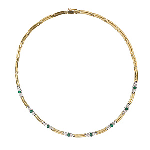 necklace, yellow gold/white gold 750/000 (tested), 8 emerald cabochon, 32 brilliants c. 0.30 ct w-si, box clasp with safety catch, length = c. 41.3 cm, total 35.7 g