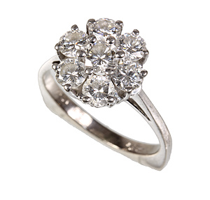 Ring, WG 750/000, zentraler Brillant ca. 0,27 ct tw-vsi, im Kranz 6 Brillanten ca. 1,0 ct tw-vsi, Ringkopf D = 11,0 mm, RW ca. 50, total 11,0 g