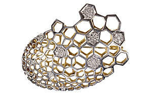 brooch, honeycomb, yellow gold/white gold 750/000, signed Rco , 33 pieces 8/8-cut diamonds c. 0.50 ct white, this brooch from the 1980s is made of 2 grids shaped like honeycombs (from the house MENRATH Heidelberg), c. 49.0 x 35.0 mm, total 14.5 g