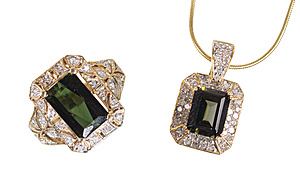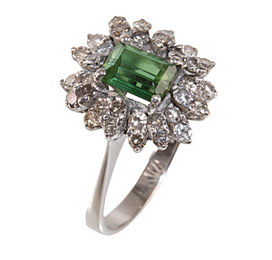Entourage-ring white gold 750/000, central green tourmaline c. 1.0 (faceted), 32 brilliants c. 0.60 ct w-si, ring width c. 54.5, total