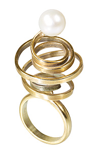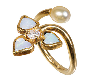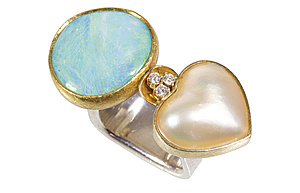 designer ring from the goldsmithy PETER PLÖDERL Mannheim, silver 925/000, yellow gold 750/000 (also higher alloy), signed, vividly colored opal (Australia c. 17.0 x 19.0 mm), heart-shaped mabe pearl, 3 brilliants c. 0.10 ct tw-vsi, ring head c. 40.7 x 21.0 mm, U shaped ring shank ring width c. 56