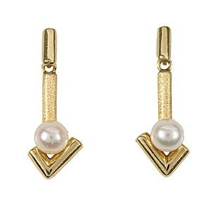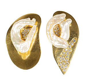 variable designer ear jewellery by the goldsmithy PETER PLÖDERL Mannheim, yellow gold 750/000, signed, 2 freshwater pearls, 35 pieces 8/8-cut diamonds white, the freshwater pearl stud earrings can be worn separate, optional the decorative gold surfaces can be worn behind ear, total 16.4 g