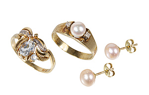 Lot: 1 Ring GG 585/000 (geprüft), 8-eckiger Amethyst ca. 11,5 ct (ca. 15,0 x 12,4 mm), RW ca. 47; Collier, GG 375/000, 3 Amethyste rund (fac.), total ca. 23,0 ct, 2 x 11,5 mm u. 1 x 15,2 mm, 4 Akoja-Perlen an Ösen aufgehängt, L = ca. 45,5 cm, total 31,3 g