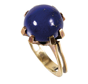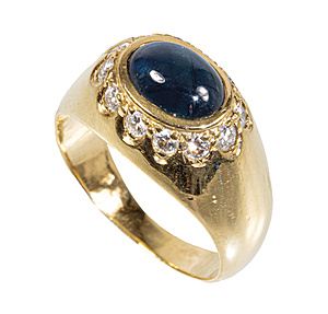 ring, yellow gold 750/00, 1 sapphire cabochon c. 2.0 ct, in the wreath 12 brilliants c. 0.36 ct tw-vsi, ring width c. 51, total 8.9 g