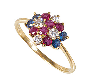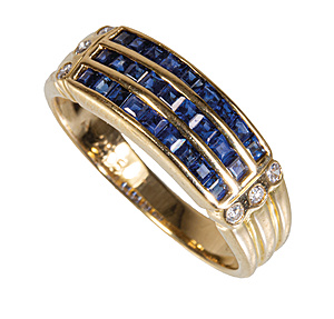ring, yellow gold 750/00, in three parallel rows are 30 sapphires in carre cut, at the side always 3 brilliants total c. 0.06 tw-vsi, ring width c. 55, total 4.3 g