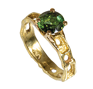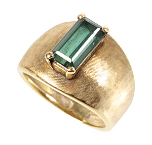 ring, yellow gold 585/000, central green tourmaline c. 1.5 ct (faceted), ring shank all round with breakthroughs, ring width c. 55, total 4.5 g