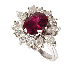 Ring, GG 585/000, 3 Turmaline, (Rubellite in Tonneauform), 6 Stck. 8/8-kant Diamanten (weiß gefasst), RW ca. 59