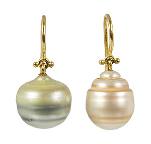 Tahiti/South Sea pearl ear pendants, yellow gold 750/000 (tested), diameter = 13.3-14.8 mm, height = c. 29.8 mm
