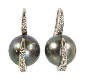 a pair of ear pendants, white gold 750/000, signed VS, 2 Tahiti pearls diameter = 12.5 mm, 22 brilliants c. 0.43 ct tw vsi, height = c. 24.0 mm