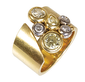 designer ring by the goldsmithy PETER PLÖDERL Mannheim, yellow gold/white gold 750/000, (also more highly alloyed), signed, 3 brilliants c. 0,37 ct tw-vsi, (white set), 2 brilliants slightly toned, c. 0.5 ct and 0.8 ct (natural-colored), 1 diamond-drop c. 0.35 ct yellow (c. 5.0 x 4.0 mm), ring width (at the top) c. 18.0 mm, downwards slight graduated, ring width c. 60, total 23.3 g