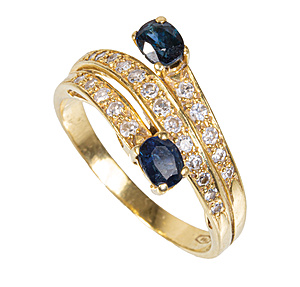 ring, yellow gold 750/000, at the ends 2 faceted sapphires, c. 0.5 ct, 23 pieces 8/8-cut diamonds white, ring width c. 56