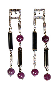 a pair of ear pendants in ART-DECO style, white gold 585/000, onyx little sticks with ruby balls, in the graphic elements are 28 brilliants c. 0.15/0.20 ct white, height = 51.0 mm (2 different brisures !)