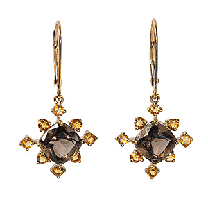 ear pendants (hinged clasp), yellow gold 333/000, 2 central cushion shaped smoky quartzs, in the wreath always 8 faceted topazes , height = 33.8 mm