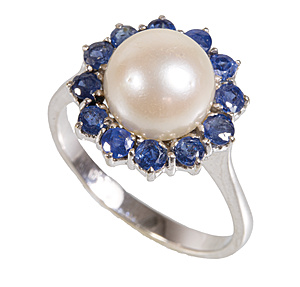 ring, classic, white gold 750/000, central Akoya pearl diameter =8.7 mm, in the wreath 12 sapphires (faceted) c. 1.1 ct, ring head diameter = 14.0 mm, ring width c. 55, total 4.3 g