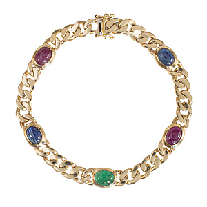 bracelet classic, yellow gold 585/000, 2 rubies c. 3.2 ct, 2 sapphires c. 8.0 ct and 1 emerald c. 1.6 ct (all cut ascabochon), box clasp below with 2 safety catch, length = 19.8 cm, total 25.5 g