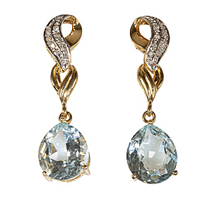 a pair of ear pendants, yellow gold 585/000, 18 pieces 8/8-cut diamonds white (white set), 2 hanging aquamarines pear-shaped c. 8.5 ct (faceted), height = 34.5 mm, total 6.3 g