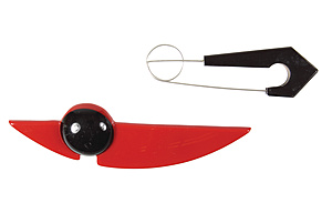 Lot: formschönes DESIGNE aus dem ART-DECO, 1 Nadel, Bakelit/Stahl, L = 10,4 cm; 1 Brosche in leuchtendem rot mit einem schwarzen Auge, L = 14,0 cm