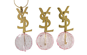 lot: YVES SAINT LAURENT, gilded metal, a pair of ear studs/pendant earrings height = 39.7 mm 81 mechanism is missing), 1 necklace, length = c. 44.0 cm, both with faceted pink balls