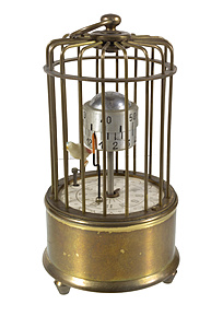 Tischuhr/Wecker, VINTAGE, im Boden signiert KAISER G.m.b.H Villingen, Vogel im Käfig schwingt im Takt, Alarm Automat, D = 67,0 mm, H = ca. 128,0 mm, Uhr läuft !