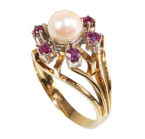 Ring, GG 585/000, in the center 1 navette-cut ruby approx. 0.40 ct, in the wreath 9 pieces 8/8-cut diamonds white, outside 12 further navette-cut rubies approx. 1.32 ct (retained), RW approx. 56, total 3.5 g