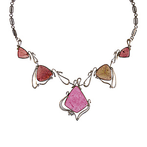 Collier, ART-DECO, BENGEL Idar-Oberstein, weißes Metall, rote Galalith Scheiben, schwarze Kugeln, als Kette feine Plättchen, vorne H = ca. 18,0 mm, L = 41.5 cm. Formschönes Design !