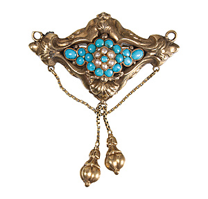 Brosche, BIEDERMEIER um 1830/50er Jahre, GG 585/000 (geprüft), zentral kl. Kranz aus 6 Stck 1/2 Perlen, 17 Türkise, Brosche plastisch ausgearbeitet, zwei an Ketten abgehängte Pampeln, ca. 40,7 x 48,0 mm, oben 2 Ösen um eine Kette einzuhängen