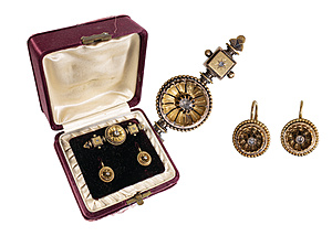 Demi-Parure, Brosche und Ohrhänger Historismus um 1870/80, wohl Süddeutsch, GG 585/000, 3 Diamanten im Rosenschliff weiß, Rosette mit umlaufendem Kugeldraht, an den Seiten quadratisch gestufte Körper; passen dazu 1 Paar Ohrhänger mit Klappbügel, H = 17,0 mm, total 4,8 g, mit Original-Schatulle !