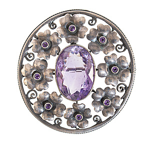 Brosche THEODOR FAHRNER, ART-DECO um 1920, SILBER 935/000, signiert TF, zentraler Amethyst ca. 12,0 ct (facettiert), in den umlaufenden Blüten 8 weitere kl. Amethyste, ca. 42,2 x 44,5 mm. Literatur bei Arnoldsche THEODOR FAHRNER SCHMUCK ähnliche S. 186