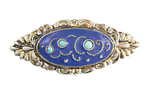 Brosche 1930er Jahre, SILBER 935/000 partiell vergoldet, blaues Mattemaille, 3 Türkiscabochons, Umrandung floral ausgearbeitet, ca. 43,0 x 19,0 mm