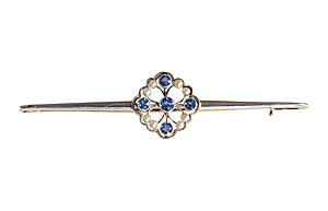 Brooch/pin, ART-DECO 1920s, GG 585/000, 5 sapphires (fac.) decorated with mill handle approx. 0.90 ct, 8 natural pearls, display side in platinum, L = 77.7 mm, with box !