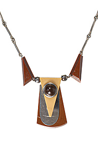 Necklace, ART-DECO 1930s, BENGEL Idar-Oberstein, white metal, geometric bodies, galalith in brown tones, front h = 42.0 mm, bar chain, l = approx. 44.0 cm