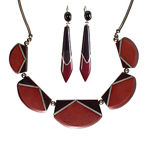 Collier, ART-DECO 1930er Jahre, BENGEL Idar-Oberstein, weißes Metall, geometrische Körper, in braunen Farbtönen gehaltenes Galalith, vorne H = 42,0 mm, Stäbchenkette, L = ca. 44,0 cm