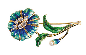 Anhänger um 1870/80, ROSÈGOLD 750/000, 39 Altschliff-Diamanten ca. 1,8 ct in einem brillantem weiß, wenig/fast keine Einschlüße (hoch geschliffen, á jour gesägt), in den stilisiertem Blüten sitzen 3 Perlen, ca. 23,6 x 32,6 mm, mit Schatulle, total 4,8 g, feine Arbeit !