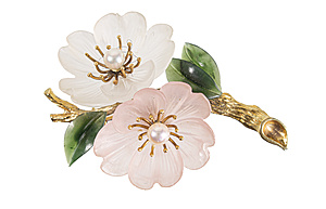 Brooch 1st half 20th century, GG 585/000, 3 Akoja pearls D = 4.5-6.2 mm, 4 diamonds white, 10 diamond roses white (white set), slightly stretched surface with floral granulated frieze approx. 2500 small spheres, approx. 47.0 x 23.0 mm, total 10.0 g