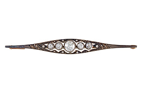 Pin, ART-DECO 1930/40s, GG 585/000 (tested), 13 old-cut diamonds approx. 1.75 ct tw/w-vsi/si (very high cut, white setting), L = 63.8 mm, total 5.8 g