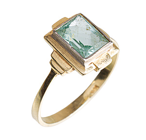 Ring circa 1900/10, GG 585/000 (tested), central emerald with chipped corners, in the wreath 14 old-cut diamonds approx. 0.25 ct white, RW approx. 56.5