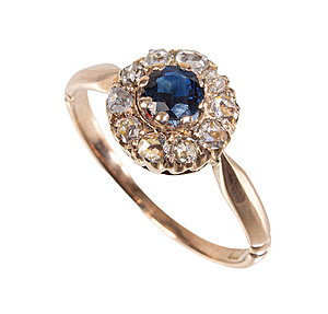 Ring, ENGLAND 1st half 20th century, GG 750/000, signed J.C.M., central old-cut diamond approx. 0.95 ct w/i-si (D = approx. 6.3 mm), each side with 1 sapphire totaling approx. 1.7 ct (faceted, with traces of wear), RW approx. 59, total 5.7 g
