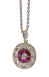 1 Paar Ohrhänger im ART-DECO Stil (mit Klappbügeln), WG 585/000, 6 Brillanten ca. 0,21 ct w/si, im Quadrat eine kl. Perle, farbintensive facettierte Rubine sowie weiße Diamantrosen runden das Bild ab, H = 43,0 mm