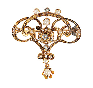 Brosche JUGENDSTIL um 1900, GG 750/000 (geprüft), zentraler Diamanten weiß, 31 Stck 1/2 Perlen (einige Fehlstellen), floral gestaltete Bögen, 1 abgehängte 1/2 Perle, ca. 34,4 x 37,5 mm, total 5,1 g