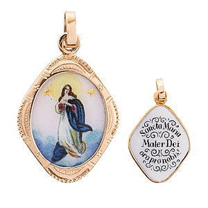 Anhänger, GG 585/000, Emailleschild mit Bildnis der MARIA, farbig bemalt, RV Inschrift: Santa Maria Mater Dei orapronobis, H = 22,0 mm