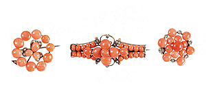 Lot: 3 Broschen um 1870/80er Jahre, SILBER, Korallenboutons (Sardegna-Koralle), partiell eingearbeitete 1/2 Perlen, längste Brosche seitlich mit gelochten Korallen, L = 48,0 mm