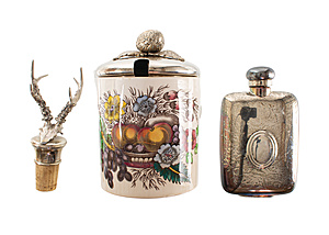Lot: 1 Flaschenverschluss GEWEIH, SILBER (geprüft), vollplastisch ausgearbeitet, H = 10,6 cm; 1 FLACHMANN, SILBER 800/000, Bajonettverschluss, H = 10,8 cm, total 95,5 g; 1 Gefäß für Marmelade, SILBER 800/000, Korpus bemalt, H = 11,7 cm, D = 7,8 cm